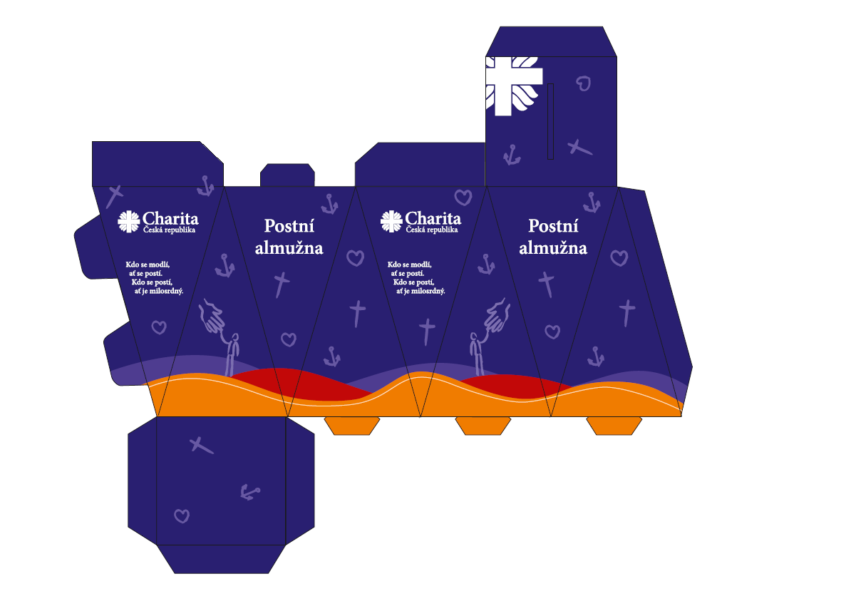 - Nepřehlédnutelný je rovněž nápis Postní almužna a pobídka: Kdo se modlí, ať se postí, kdo se postí, ať je milosrdný. A plamenný kříž, logo Charity.